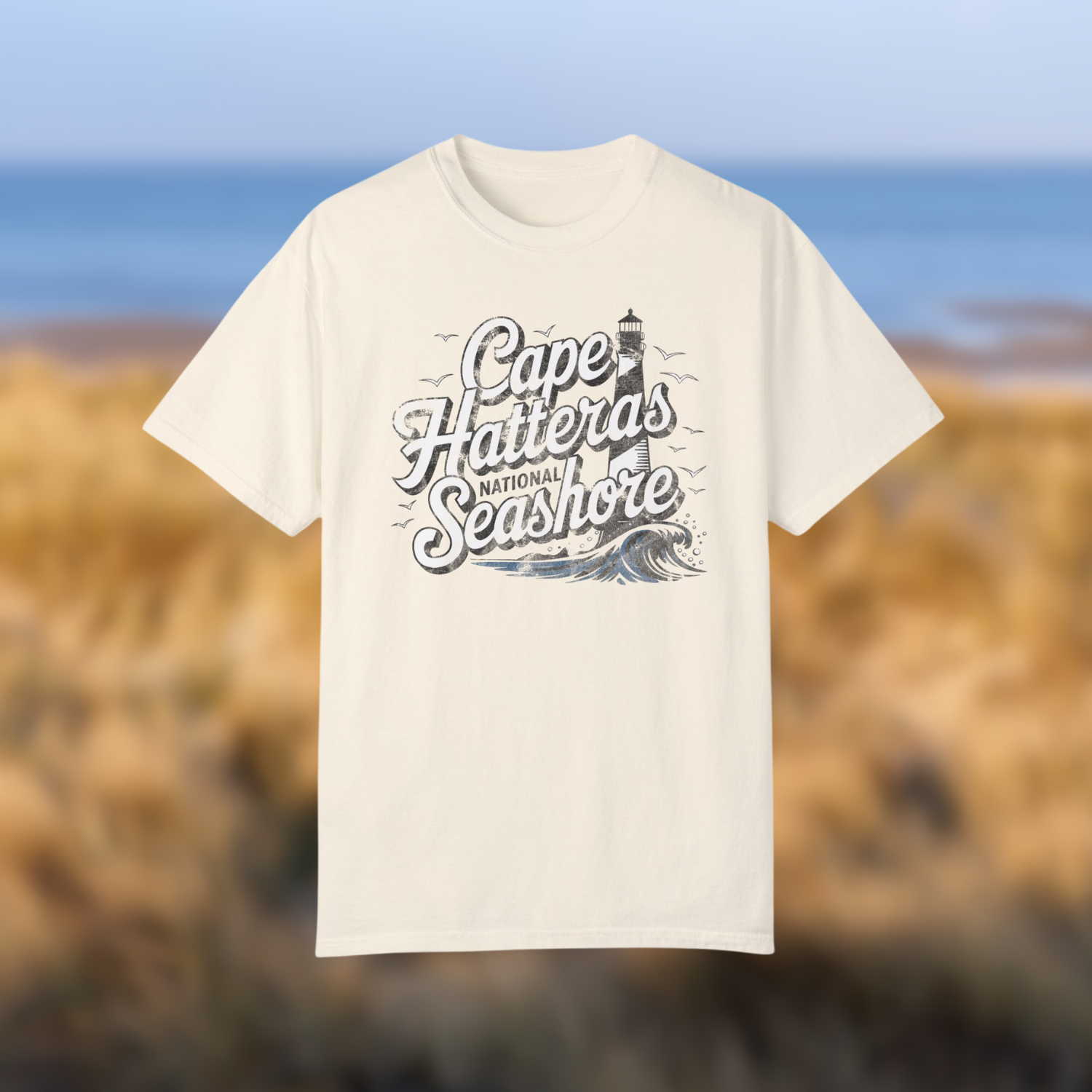 Soft, sun-faded, and made for adventure—this vintage-style tee captures the rugged beauty of Cape Hatteras National Seashore. Featuring the iconic lighthouse of the Outer Banks, NC, in muted, coastal tones, it has a perfectly worn-in feel like your favorite well-traveled tee. Whether you're exploring windswept dunes or dreaming of your next seaside escape, this one’s a keeper. 🌊⛵