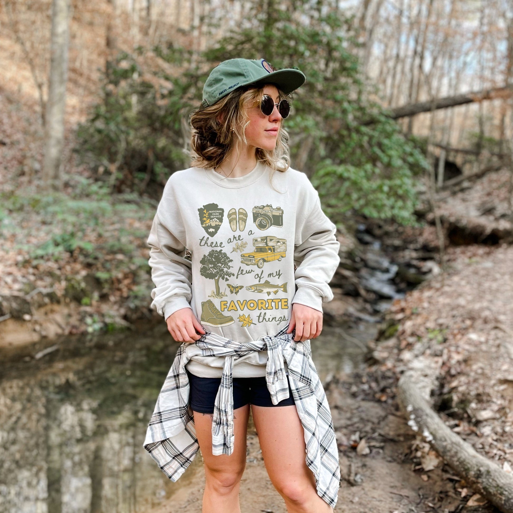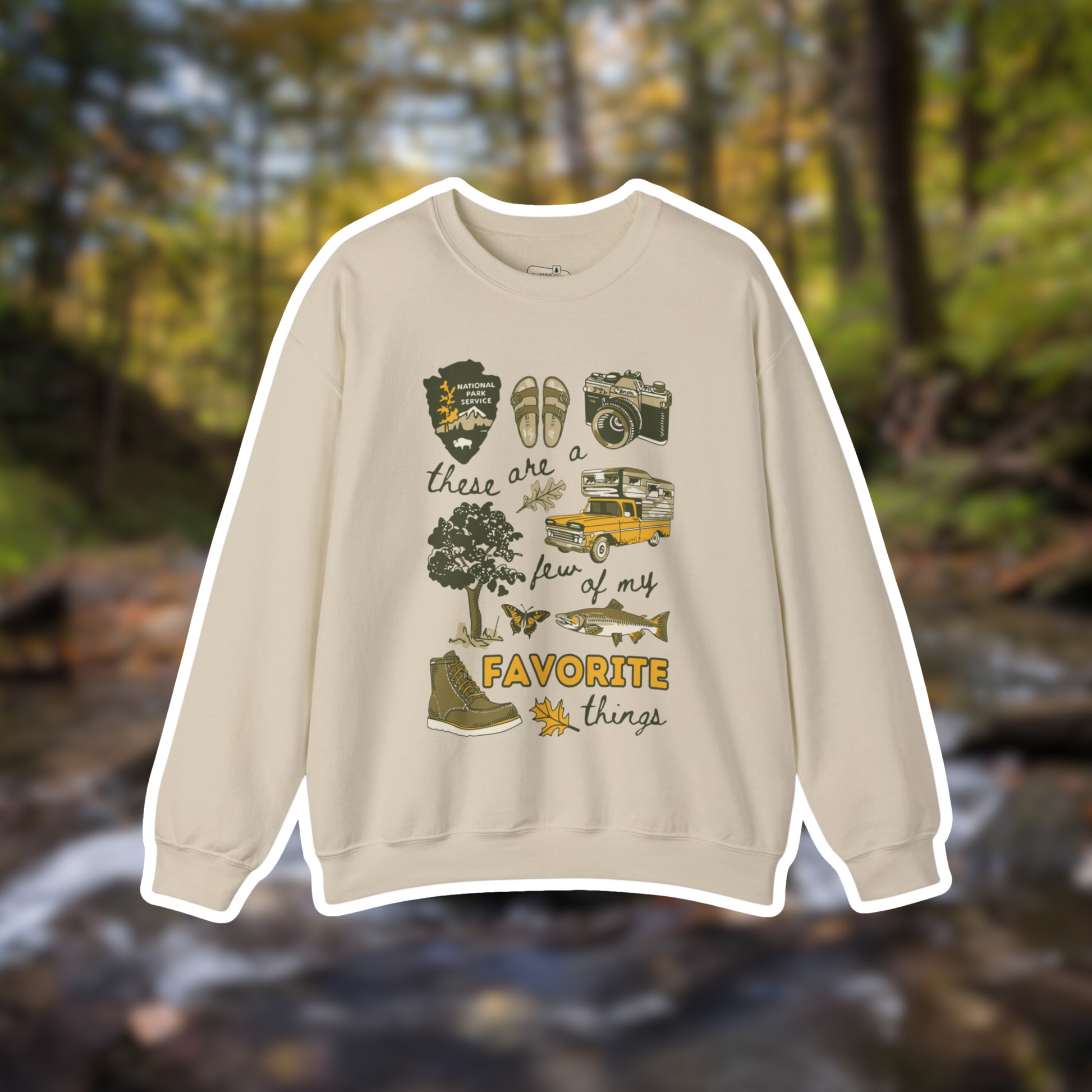 Whether you're embarking on a new adventure or simply reminiscing about past escapades, our Favorite Things National Parks Sweatshirt is your faithful companion, always ready to wrap you in comfort and remind you of the passions that make your heart sing. So go ahead, wear your loves proudly – because with this sweatshirt, your favorite things are always close at hand.