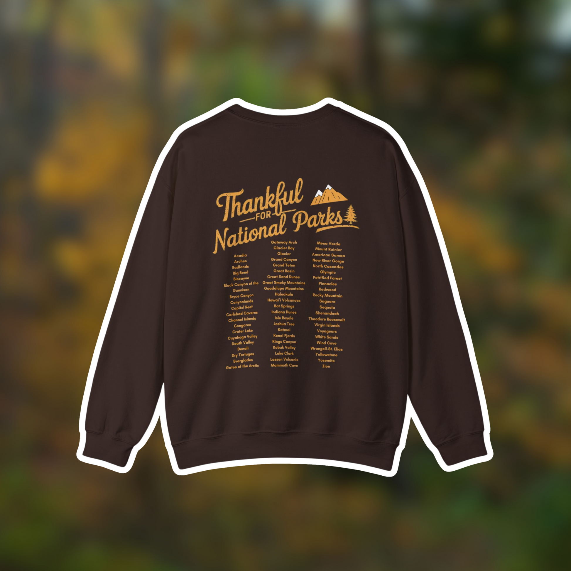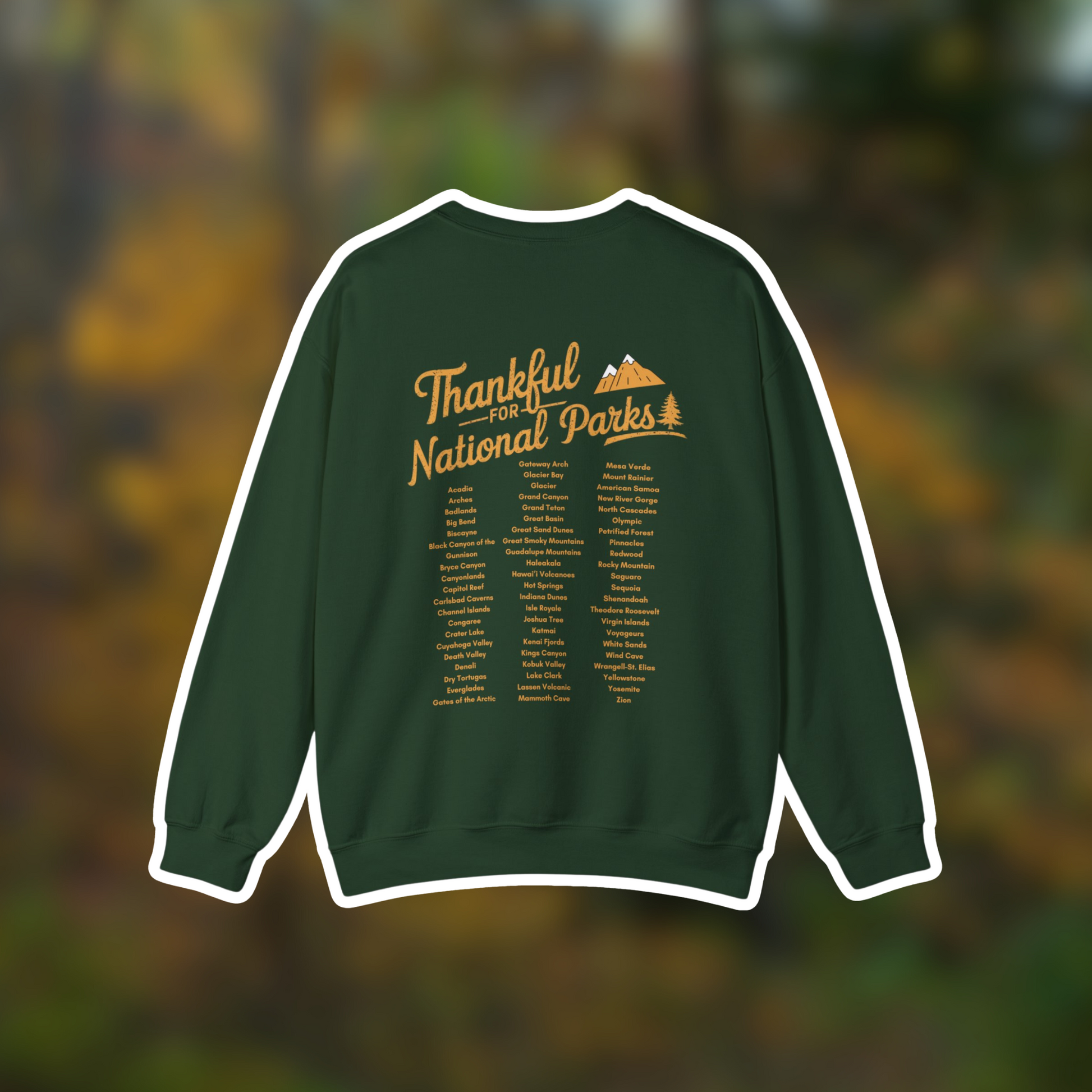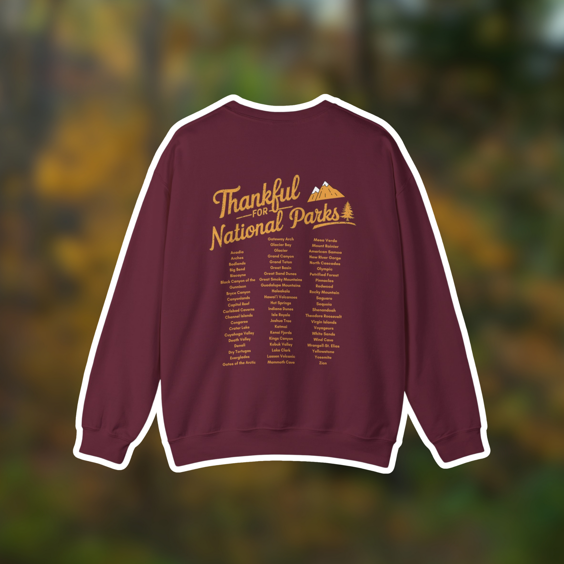 Celebrate gratitude and the great outdoors with our Thankful for National Parks Crewneck! This Thanksgiving limited edition sweatshirt features "Thankful for National Parks" on the front, with all 63 national parks listed on the back—a perfect reminder of the natural wonders we cherish. Soft, cozy, and only available for a short time this holiday season. Grab yours now before they’re gone—because this drop won’t last!
