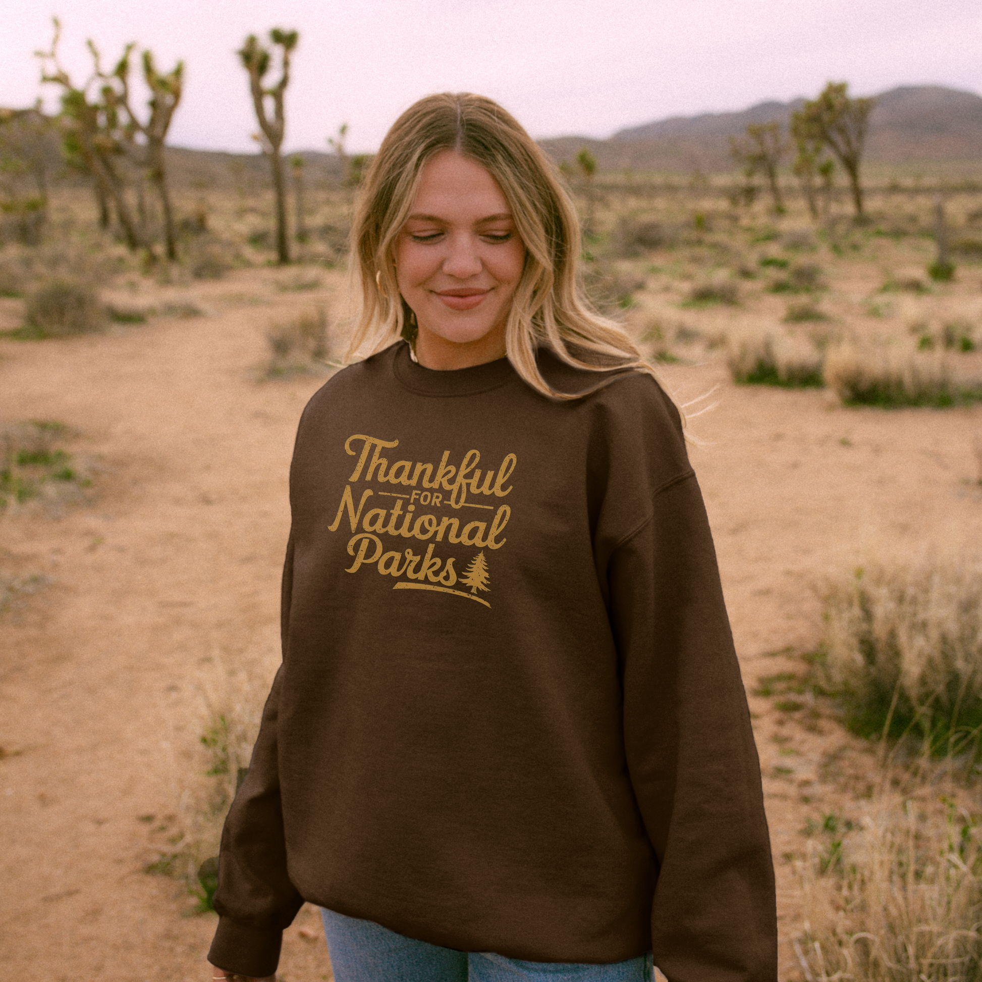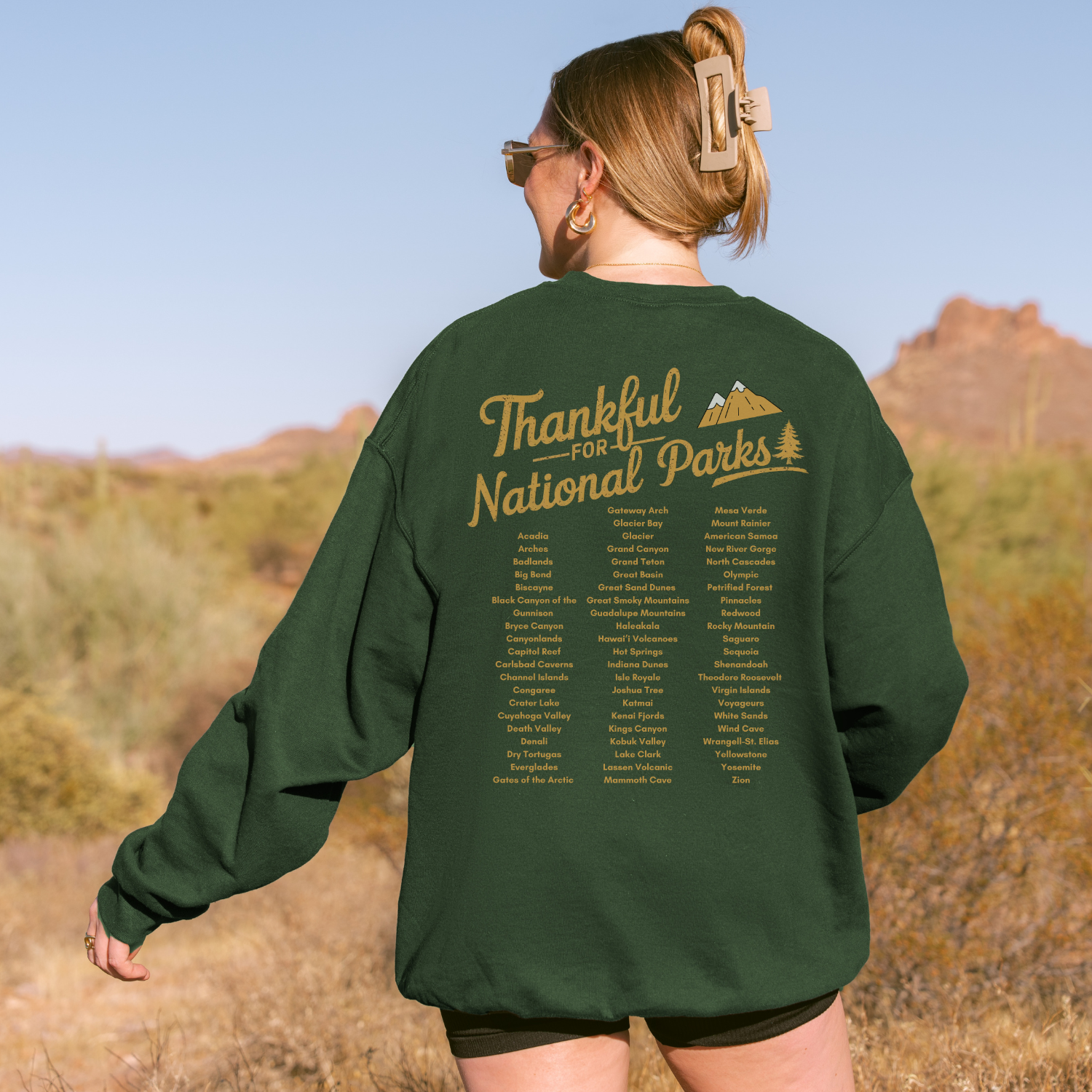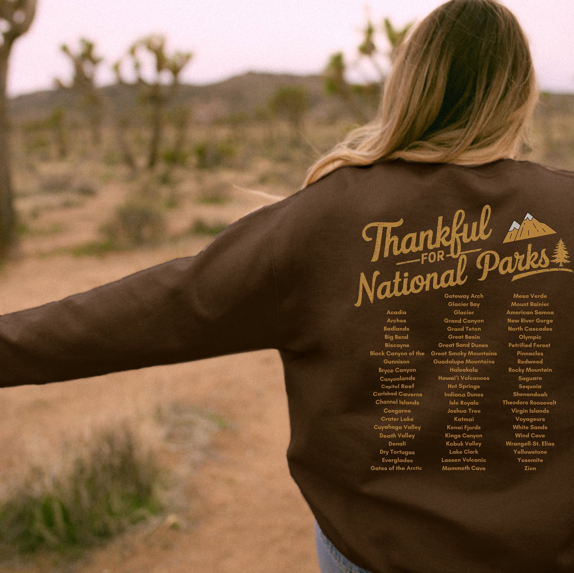 Celebrate gratitude and the great outdoors with our Thankful for National Parks Crewneck! This Thanksgiving limited edition sweatshirt features "Thankful for National Parks" on the front, with all 63 national parks listed on the back—a perfect reminder of the natural wonders we cherish. Soft, cozy, and only available for a short time this holiday season. Grab yours now before they’re gone—because this drop won’t last!