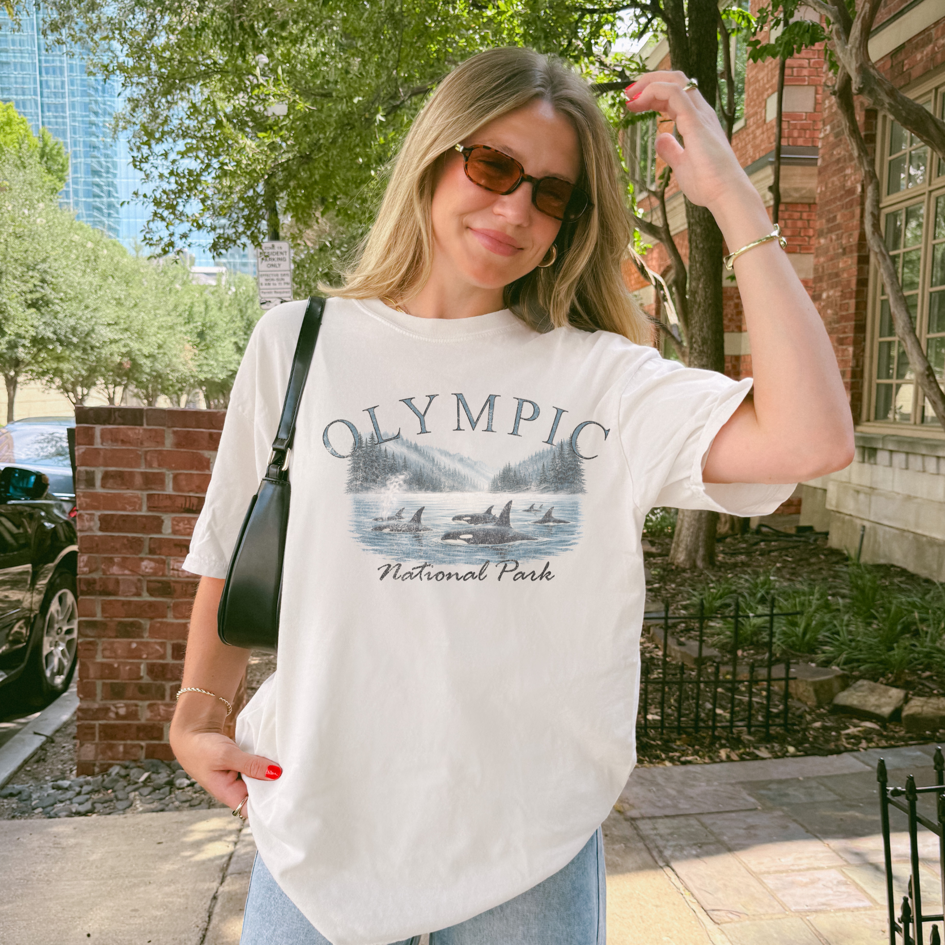 This tee feels like a vintage find from a 90s Olympic National Park gift shop. The artwork shows orcas swimming through cool blue water with forested mountains rising in the background.