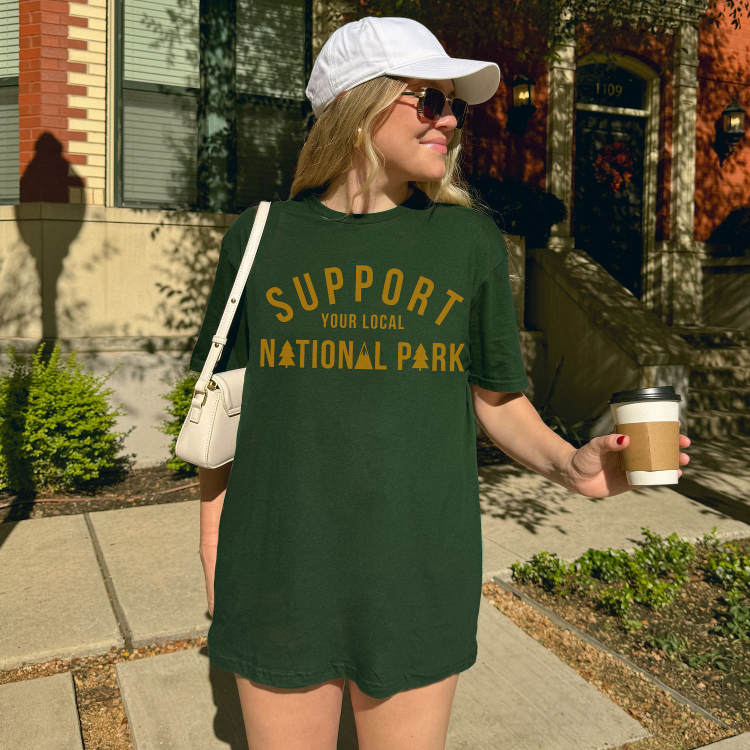 Introducing our latest t-shirt design: "Support Your Local National Park." This simple, classic tee is perfect for nature lovers and outdoor enthusiasts alike. Featuring clean typography and a timeless look, it’s a versatile way to show your passion for preserving our beautiful parks. Made with soft, high-quality cotton, this shirt is as comfortable as it is meaningful—ideal for hikes, casual outings, or just showing your love for the great outdoors.